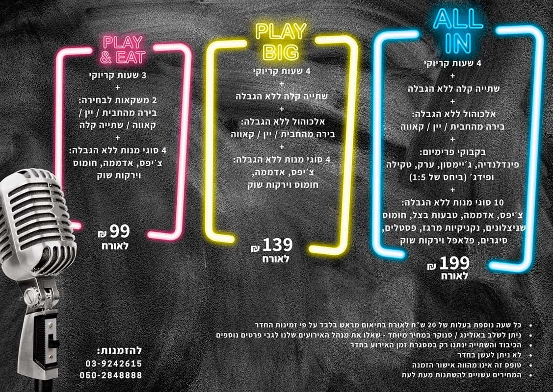 עברי, לועזי, עכשווי או משהו מפעם? לא משנה מה הסגנון שמקים אתכם מהכיסא, אתם תמצאו אותו אצלנו. בואו לחגוג, לשיר, לשתות ולאכול בחדר האירועים והקריוקי החדש שלנו, עם למעלה מ-50,000 שירים מכל הסגנונות שמחכים רק לכם.